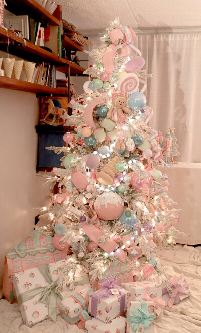 The centerpiece of our Candyland theme is the Christmas tree, decked out in a pastel paradise. Think ornaments shaped like candy canes, lollipops, and frosted cupcakes in shades of blush pink, mint green, buttery yellow, and soft lavender. Each ornament is carefully selected to capture the playful spirit of a candy shop while maintaining a chic and polished aesthetic.
